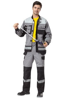 Цвет: серый с черной и светло-серой отделкой. Ткань верха: "Томбой" (Carrington, Англия) 65% полиэфир, 35% хлопок, пл.245 г/м2, «Кошачий глаз» (100% полиэфир), пл. 156 гр/м² (для накладок). Защитные свойства: Ми З.ГОСТ 27575-87