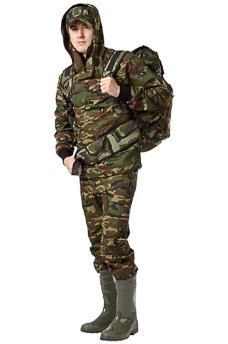 Цвет: КМФ зеленый. Ткань: смесовая, 65% полиэфир, 35% хлопок, пл. 210 г/м², ВО. ТУ 17 РСФСР 5109240-5584-90