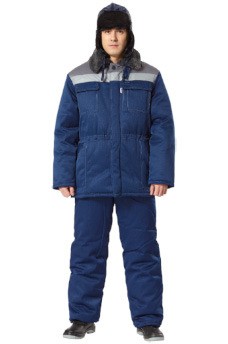 Цвет: синий с серым.Ткань: смесовая(49% хлопок, 51% полиэфир) пл.210 г/м2, ВО. Утеплитель: синтепон, в куртке 400 г/м2, в брюках 300 г/м2.Подкладка: 100% полиэфир.Защитные свойства: Тнв Ми З Ву.ГОСТ 29335-92